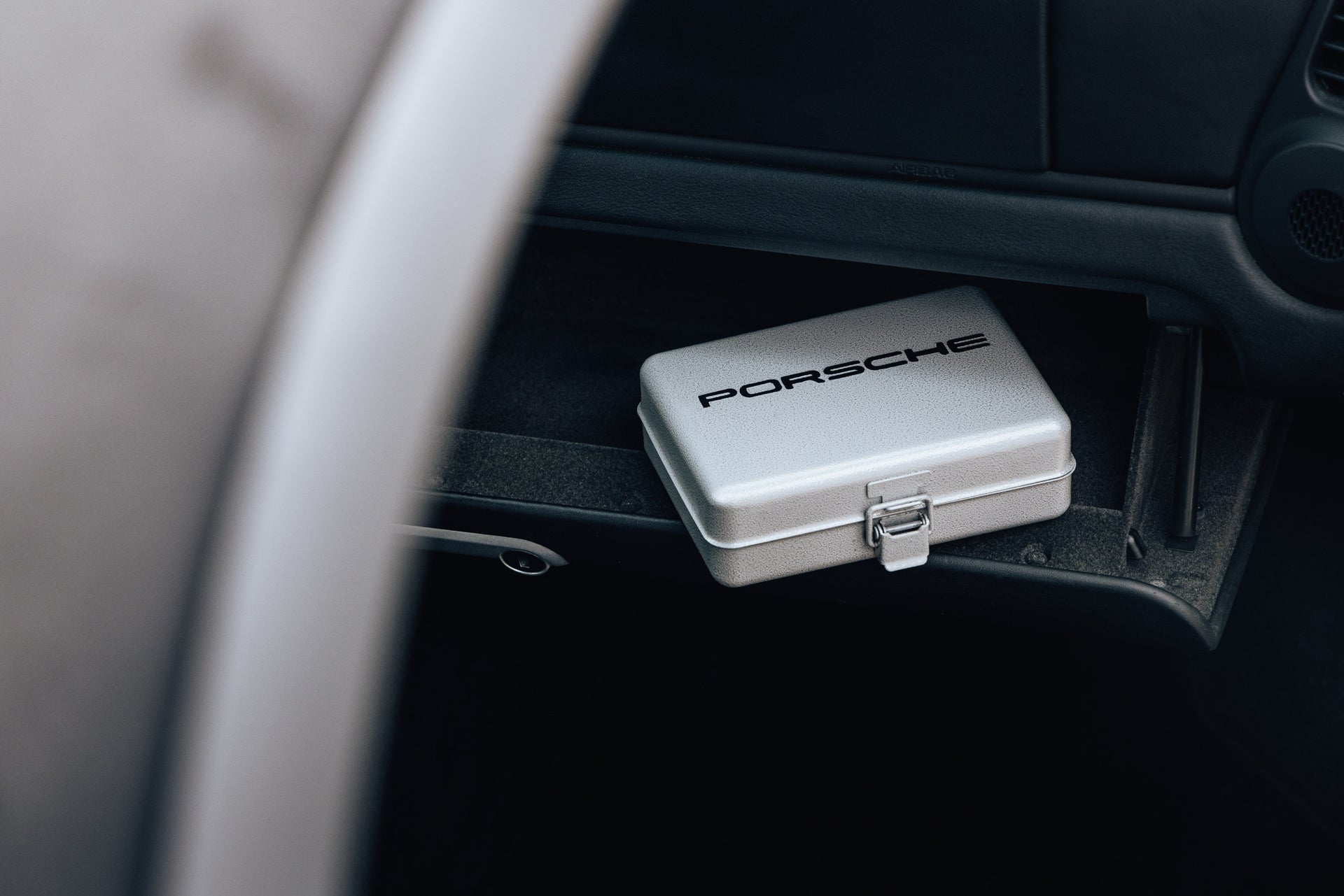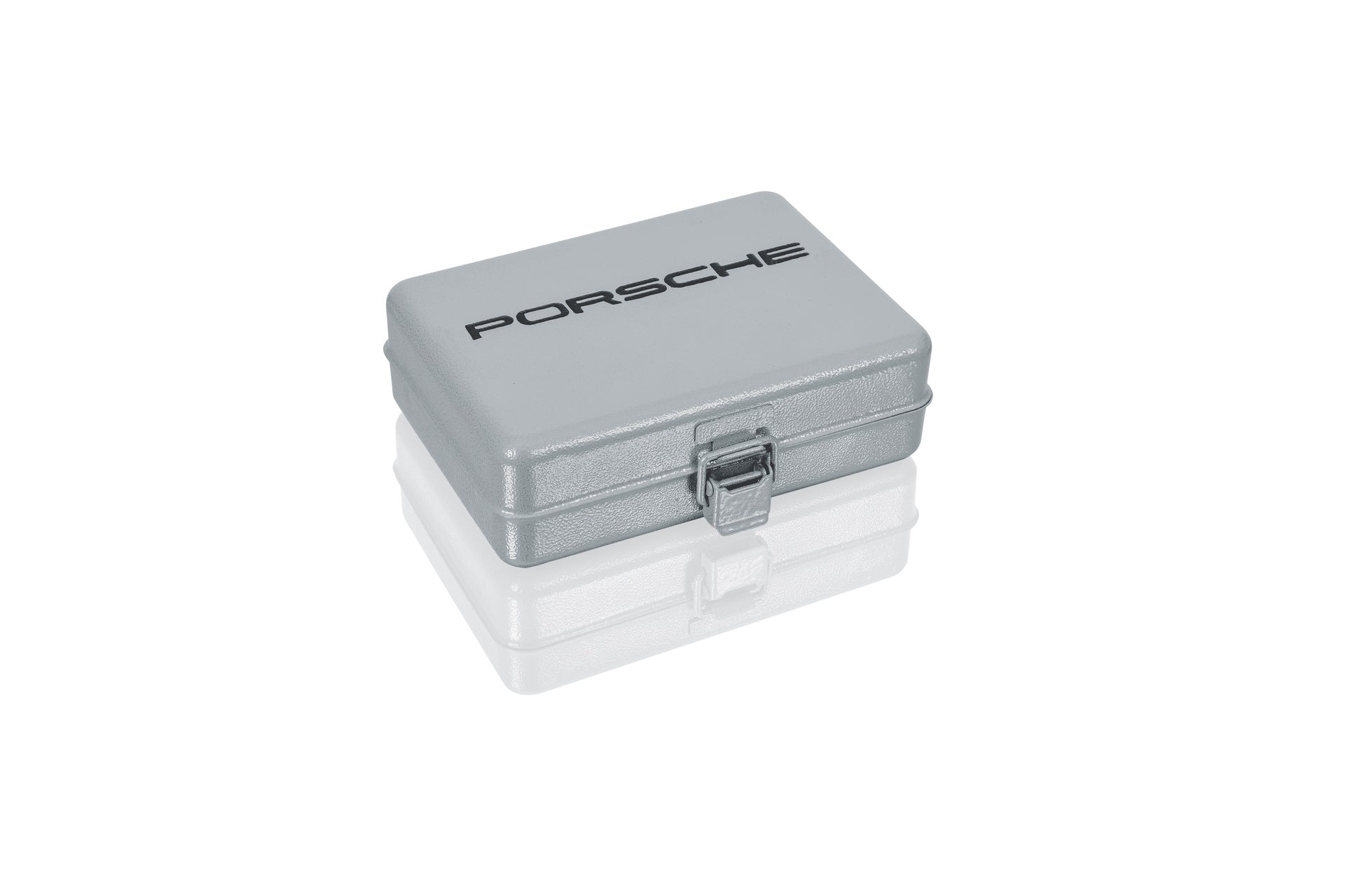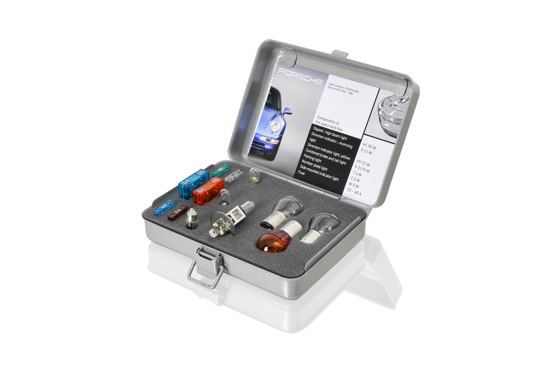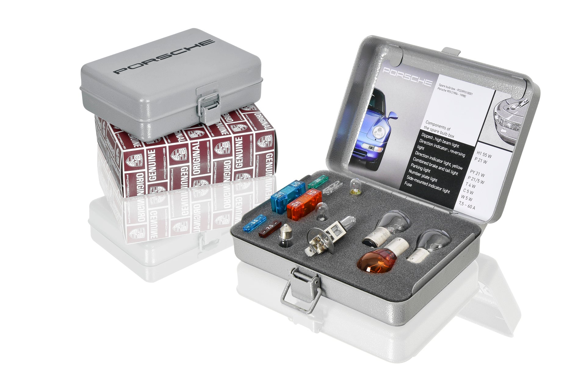 Reissued by Porsche Classic: a set of light bulbs and fuses (12 volts), specially put together for the Porsche 911, type 993. The bulbs and fuses are stored in a metal box in historic Porsche Silver, with a raised PORSCHE logo in Black and a foam insert inside.